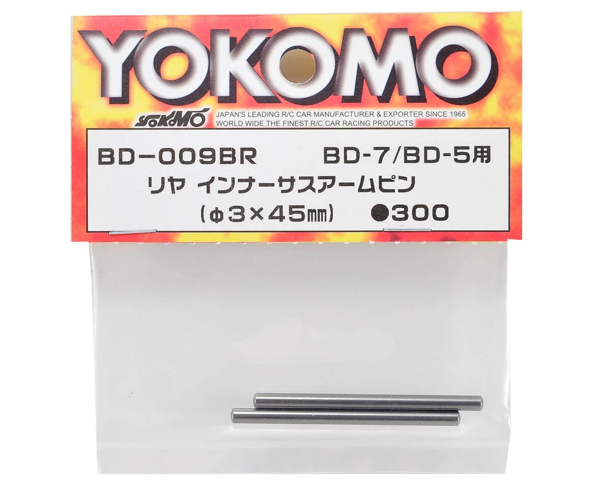 This is a pack of two replacement Yokomo 3x45mm Rear Inner Suspension Arm Pins, and are intended for use with the Yokomo BD7 1/10 scale touring car.