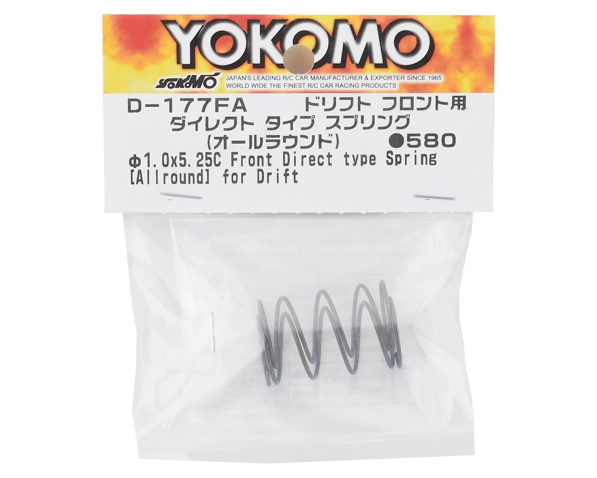 The Yokomo YD-2 Front Direct Type RWD Drift Spring is a rough winding type with excellent response developed for RWD drift applications. This spring is designed to maximize the properties of the spring material by eliminating the paint from the surface. It responds sharply to steering input and improves driving feel with a high level of response. Even under high speed driving, understeer is not likely to occur. The all-round type is suitable for carpet and asphalt surfaces.