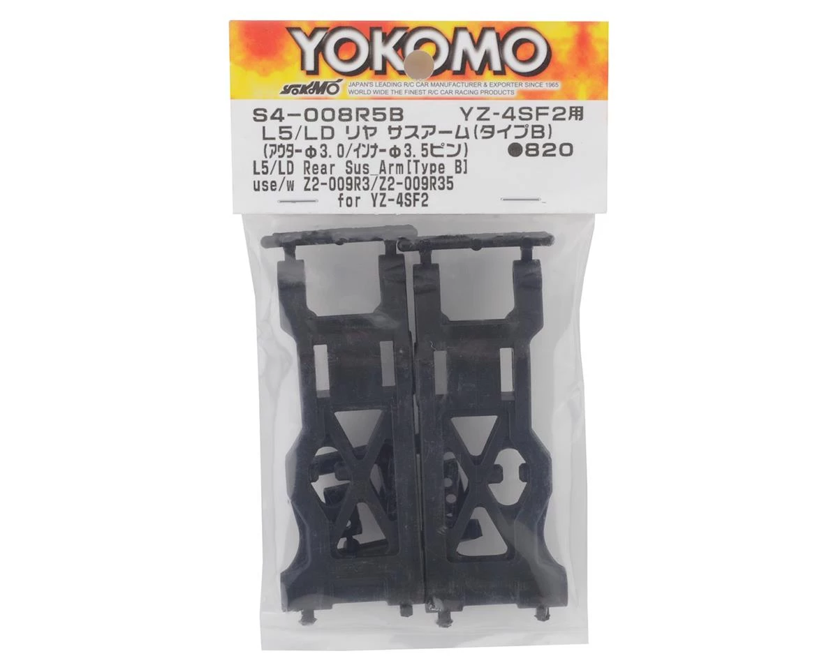 Yokomo YZ-4 SF2 L5/LD “Type B” Rear Suspension Arms. Package includes two replacement rear suspension arms with 3.5mm inner suspension holes, and 3.0mm outer suspension pin holes.